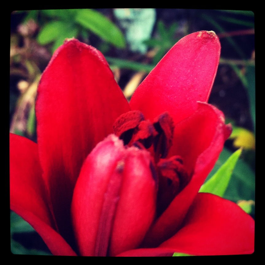 Near the end of the garden centre year (around the end of June usually) I saw some packages of lily bulbs that were only $1. They were already sprouted and looked like twirly white little lily zombies. But for $1, I couldn’t pass them up. I wanted red lillies for a while, and this was my chance. The picture on the bag was a beautiful deep crimson lily. They are called “Commander In Chief.” This was more of a rescue mission, and I never expected that they would actually survive, let alone flower. But they did indeed, just before the first snow fall too: