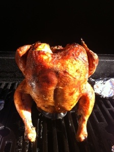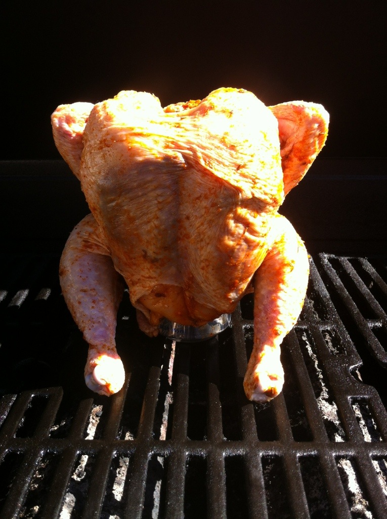 Once your chicken is all prepared (with whatever run/marinate you chose). And your beer can has been stabbed a few more times on the top of it… Place chicken onto the beer can.