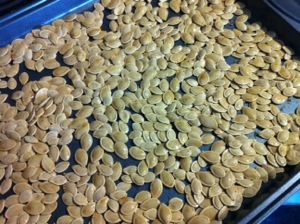 Step 8: Spread your salted seeds out evenly on the prepared cookie sheet, and place into your oven. Store them around every 10-15 minutes until they are crispy and dried. This usually takes around an hour, depending on the amount of seeds you are preparing.