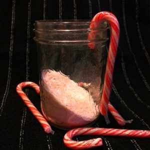 -Put smashed candy cane powder into a jar (I used a 500mL)