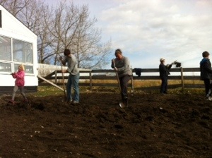 The garden area, just outside the greenhouse, has just been grass for close to 10 years, so we have a battle ahead of us. We are trying to get as much of the grass roots out that we humanly can. And the best way to do it is with good old fashioned hard work. On (Canadian) Thanksgiving Weekend, the two of us, and Cal’s kids and boyfriend and the land owner, and a few other people he rounded up, got to work. With 8 people, the work goes much faster, and we got the outdoor area dug and rotor-tilled, and as much of the grass and rocks removed as possible.
