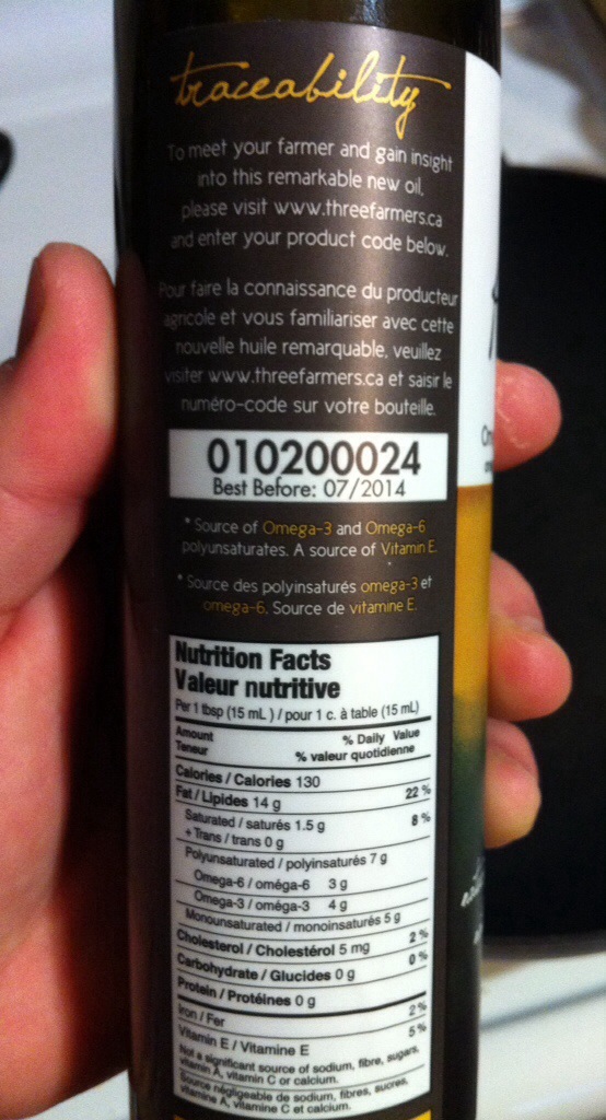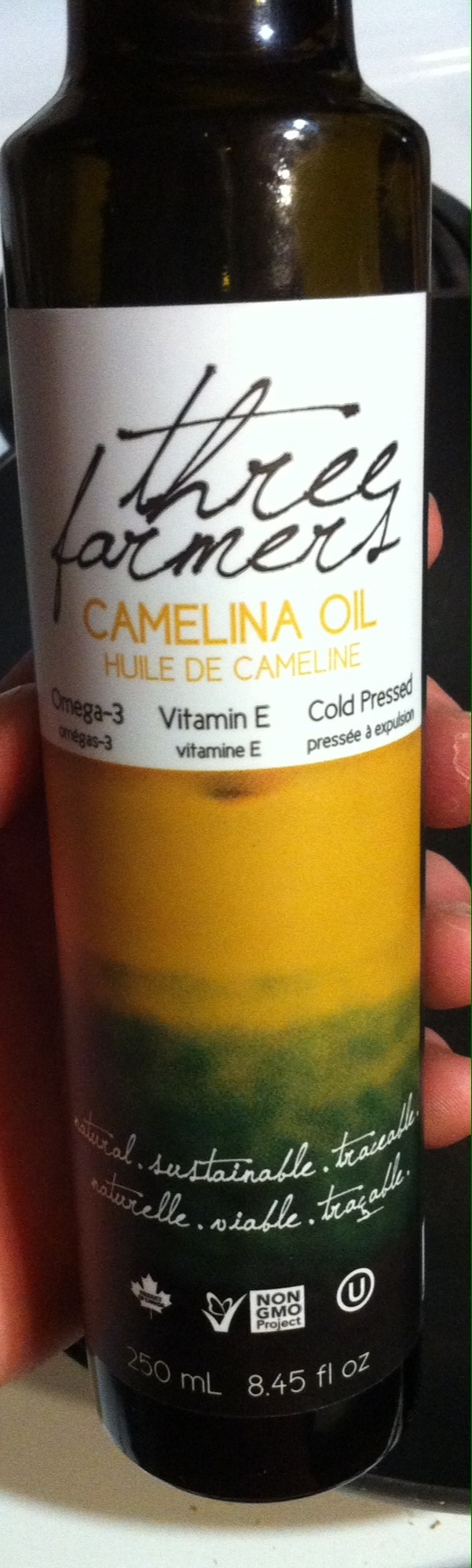 I first heard about Three Farmers Camelina Oil from the Localize Project. After visiting their website, I knew I wanted to try this product. I like the idea of being able to trace where my oil came from. It was exciting to type in my code on the bottle and find out that “My” farmer was Colin. Here is where my oil came from (hopefully the link works). And I like that they are using sustainable farming practices.