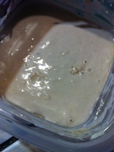 Ok, so now whisk it all together again, then remove half of it. You could leave it if you really want, but you will just end up with too much starter. That is a lot of yeast “mouths” to feed… Removing half keeps everything at a more manageable level.