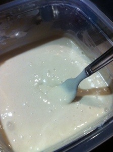 I know that is a terrible picture, but it is the best I can get right now. See those tiny frothy bubbles… Those are indicating we are almost ready to make bread. Same with the liquid on the surface…. I’m not ready yet, so I’m doing one more day of mixing, dumping half, mixing in the flour and water, and covering.