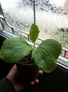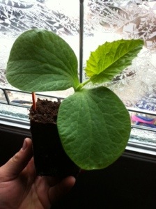 My EZ Gro Monster Pumpkin seedlings are now sporting their first true leaves.