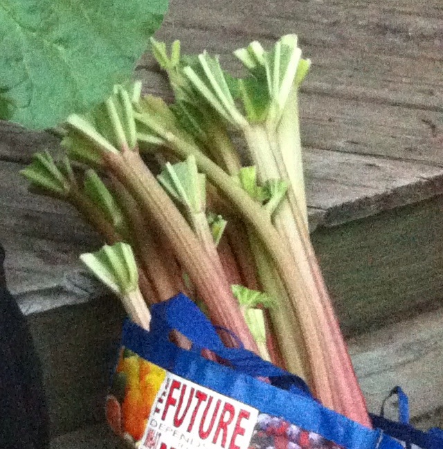 Because I will have to wait until I get back to my own house to freeze or otherwise preserve this harvest, I did some googling to find the best method of prolonging the rhubarbs freshness. If you leave 1-2 inches of the leaf on the stalk, it helps keep it from wilting so much. Let’s keep our fingers crossed that it works out!