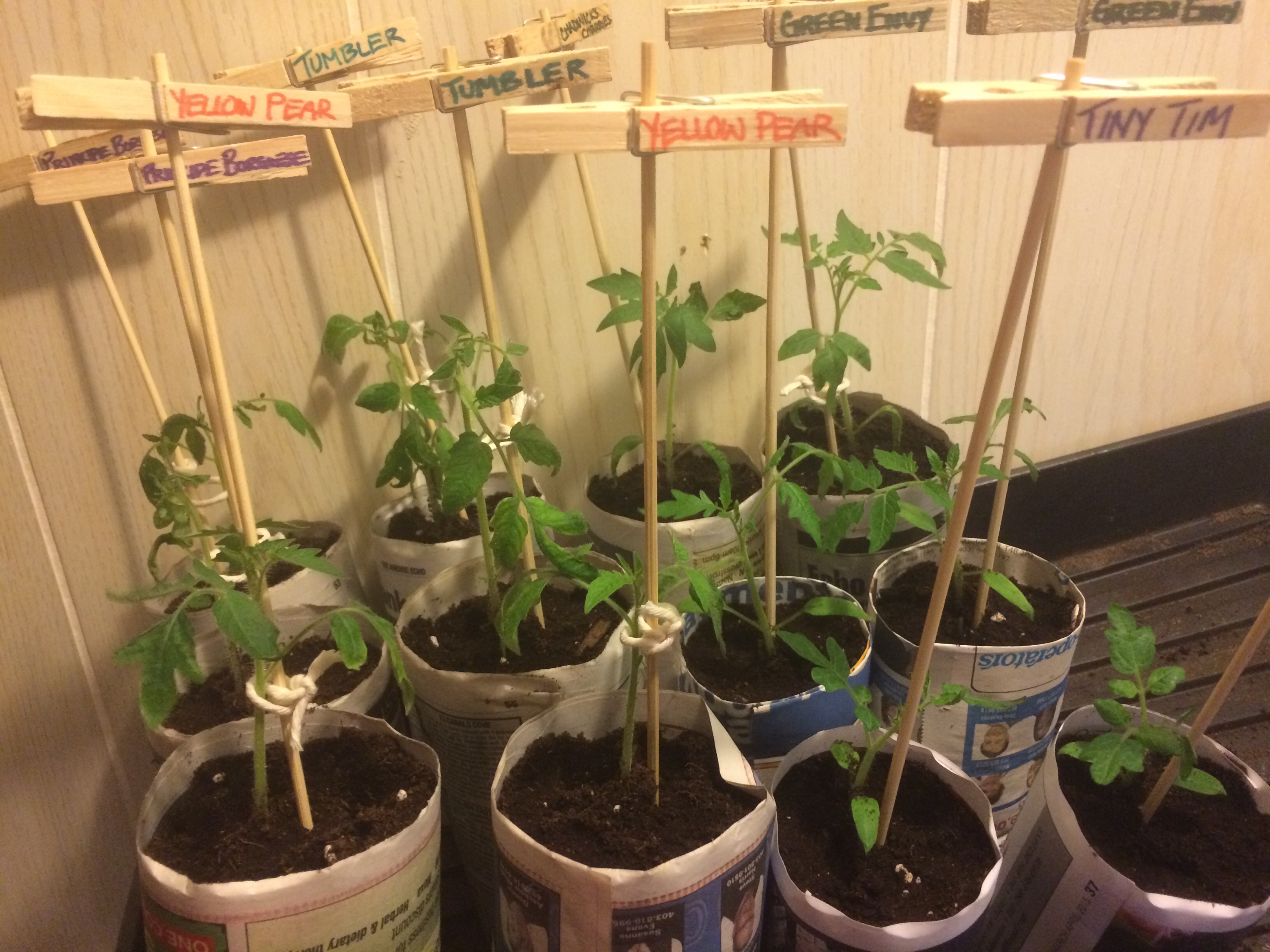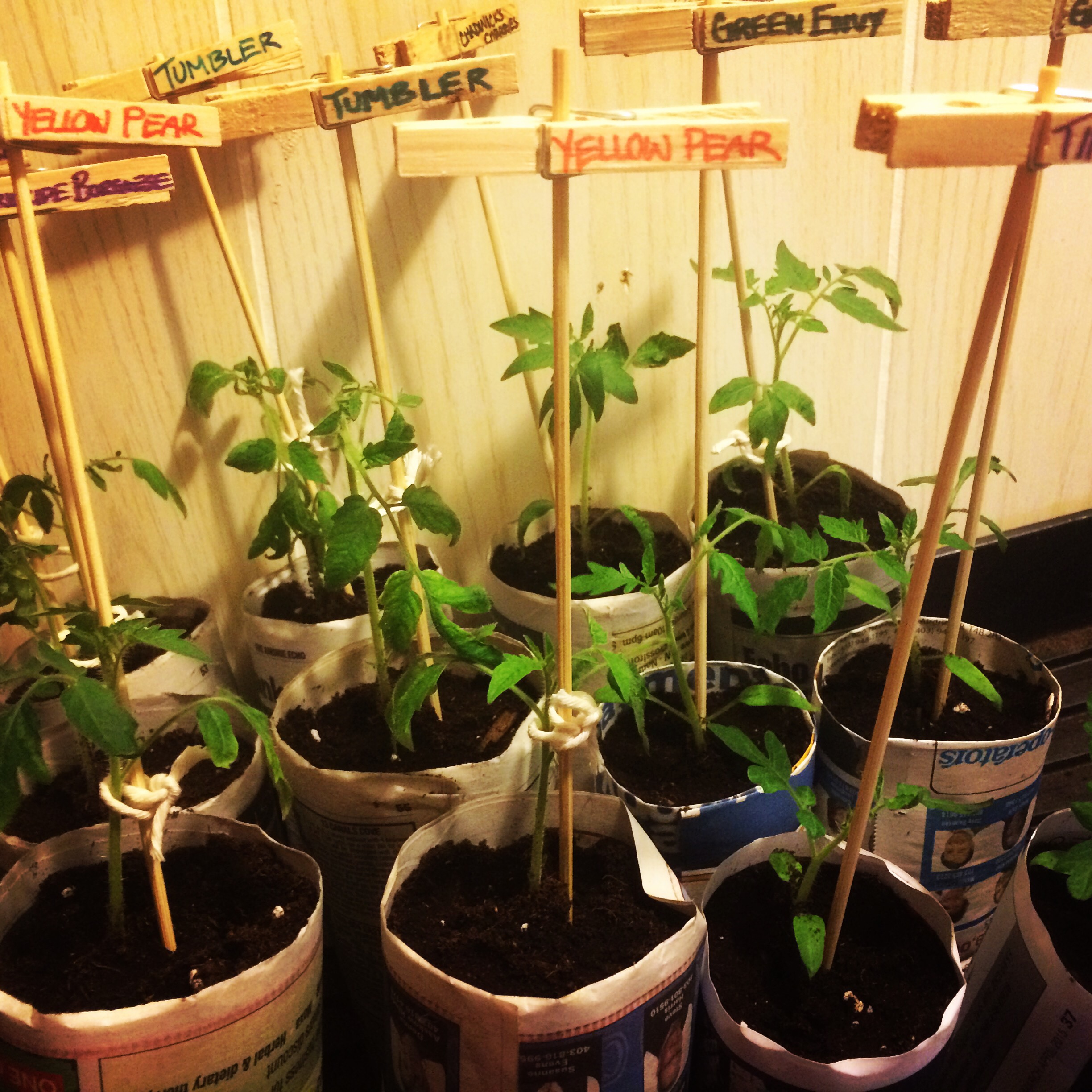I am potting them all up into home-made newspaper pots… Partly because it is free, compostable and easy, and partly because I don’t have enough pots for ALL the things. The other great thing about newspaper pots, is you can make them whatever size you want, so I can get some more height in my tomato pots than a traditional black plastic pot.