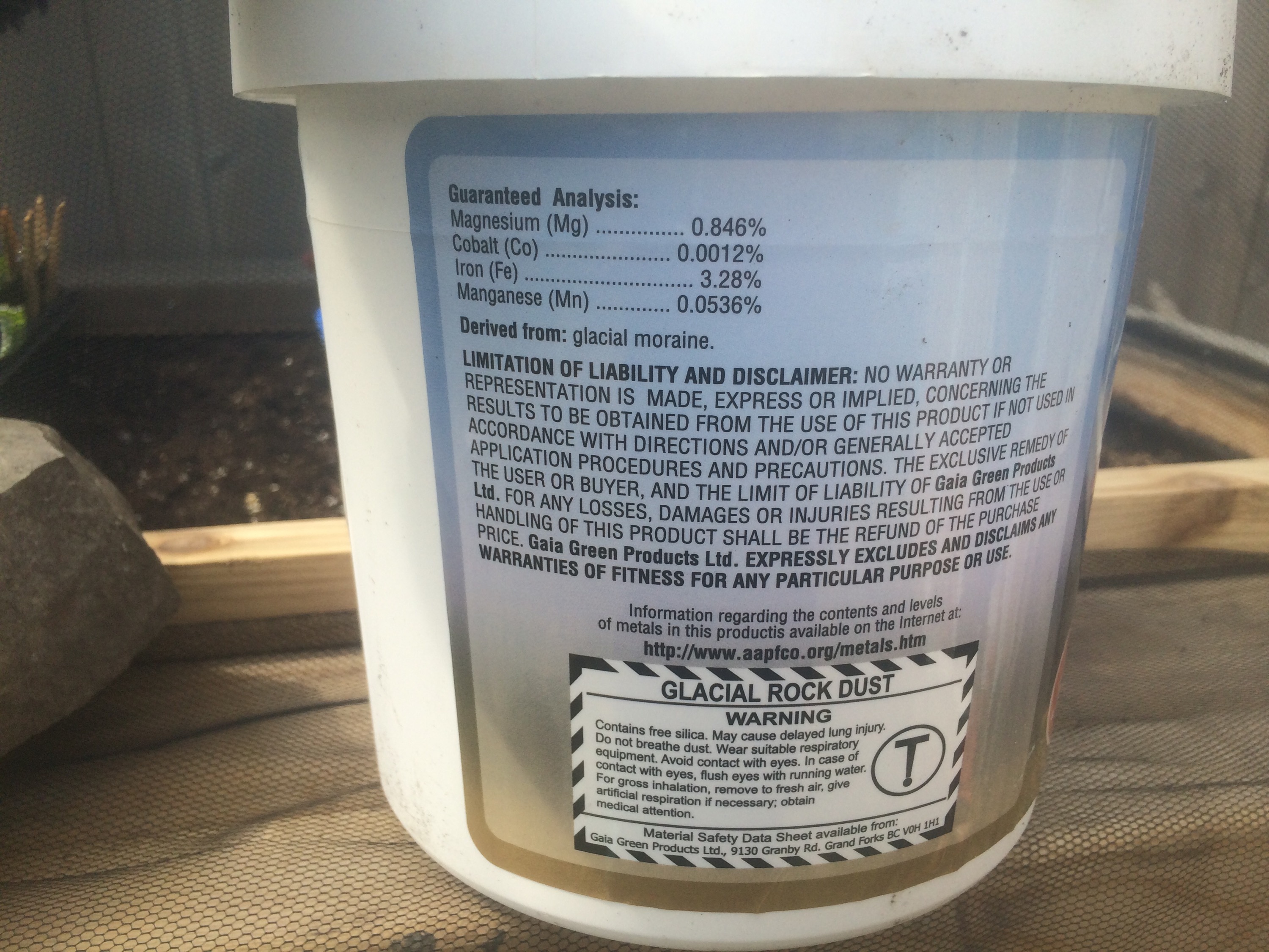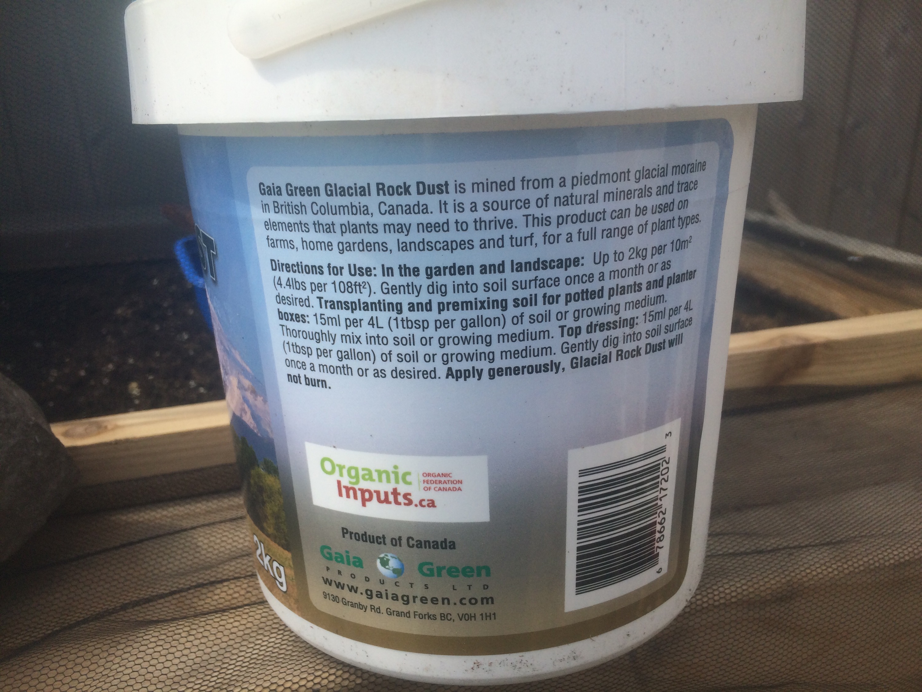 I’ve been hearing about how great rock dust is for your soil… Feed your soil to feed your plants to feed yourself. So when I saw some Glacial Moraine Rock Dust in the garden centre, I treated myself. I guess technically, I used the birthday money my grandma gave me to treat myself… so Thanks Grandma!