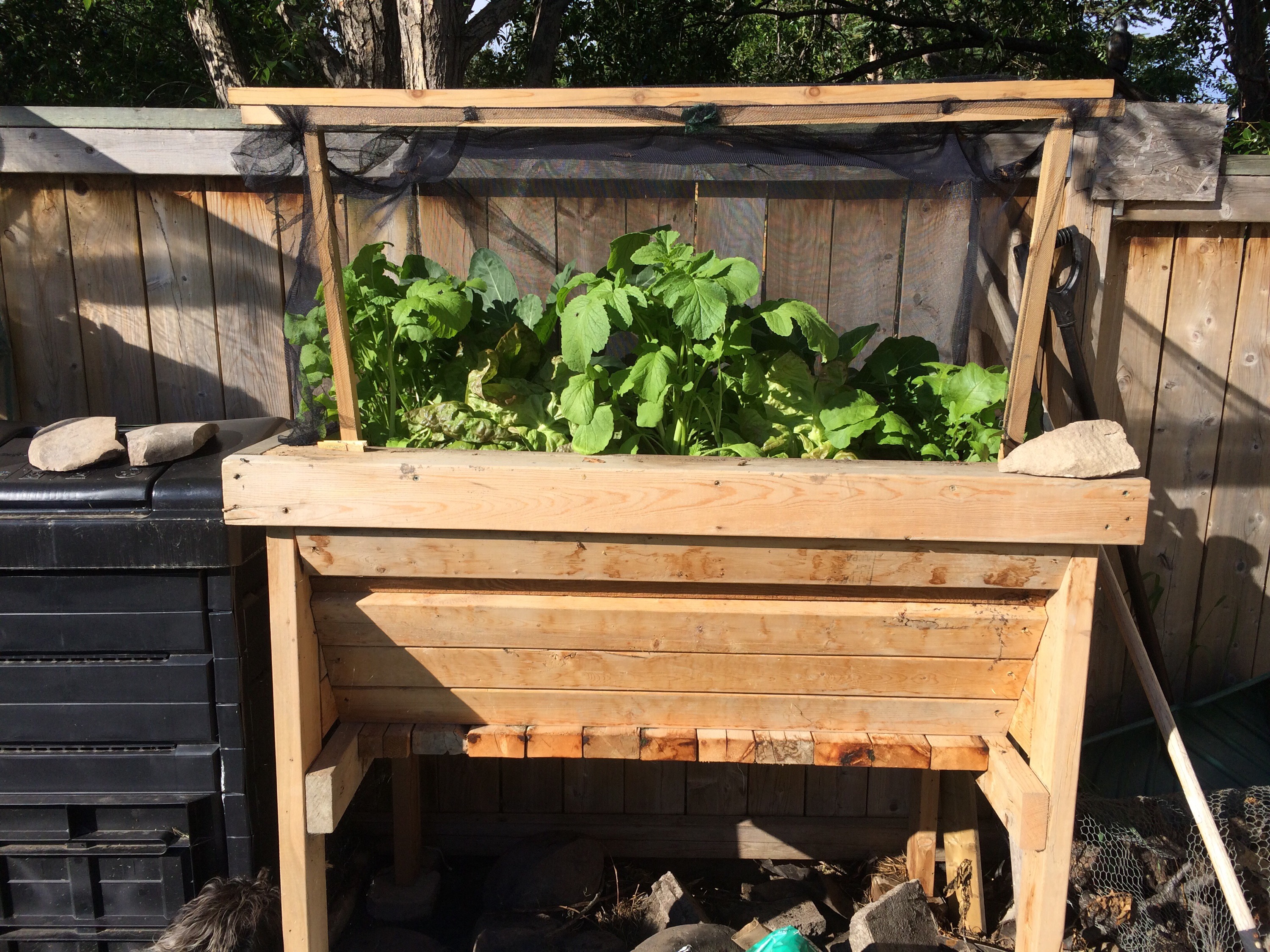This is my salad bed planter. My fiancé built it for me last year. It’s awesome because it is raised up off the ground, so it warms up faster in the spring… And no dog pee gets on the food. However in full sun in the summer, it dries out way too fast, so I moved it to the shady side of the yard this year for lettuces and fast growing things. There is sun here in the morning until about 10am, then dappled shade for the rest of the day.