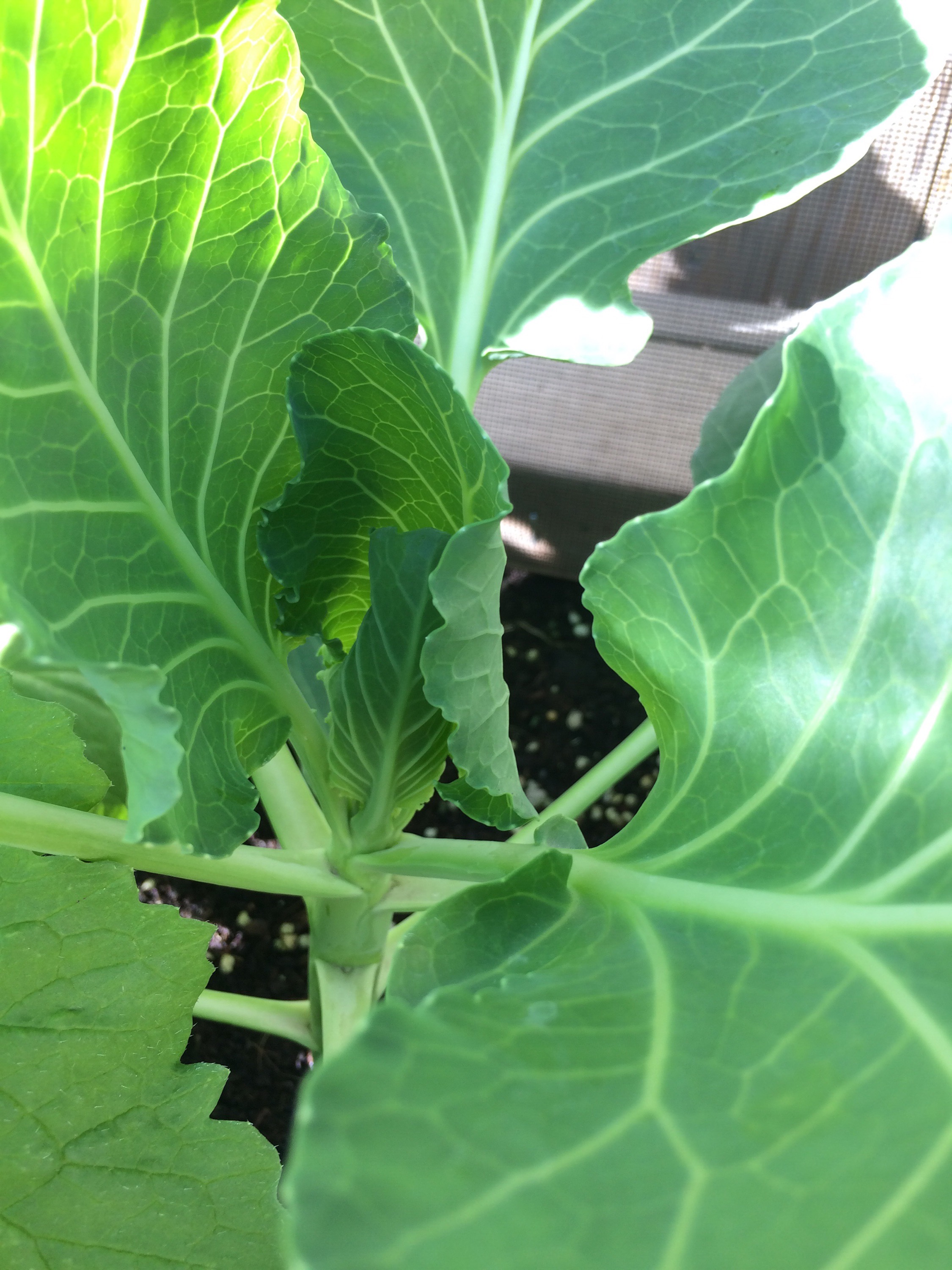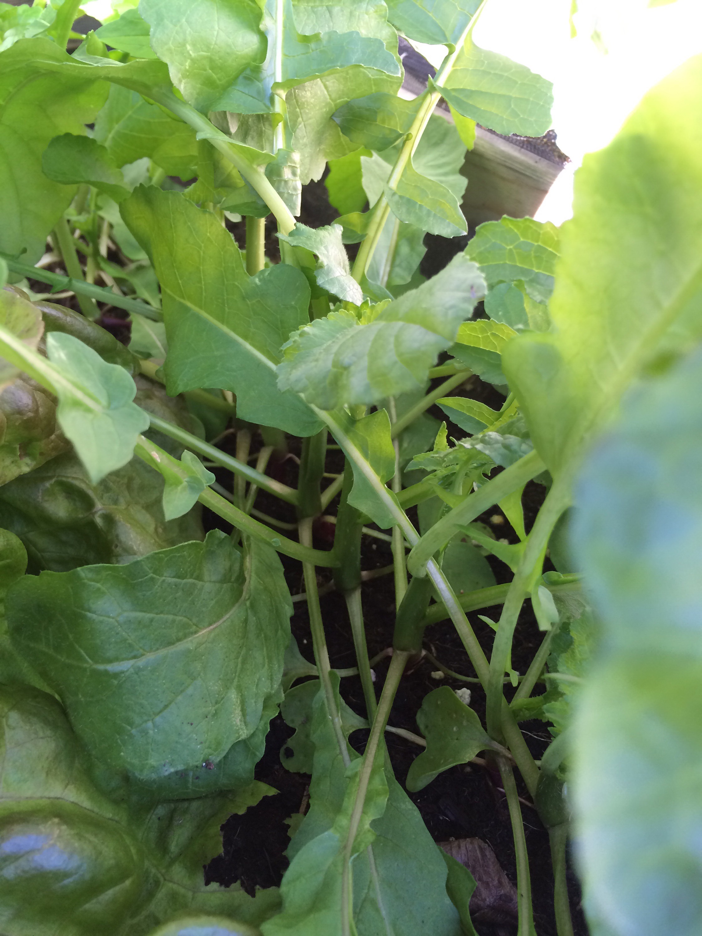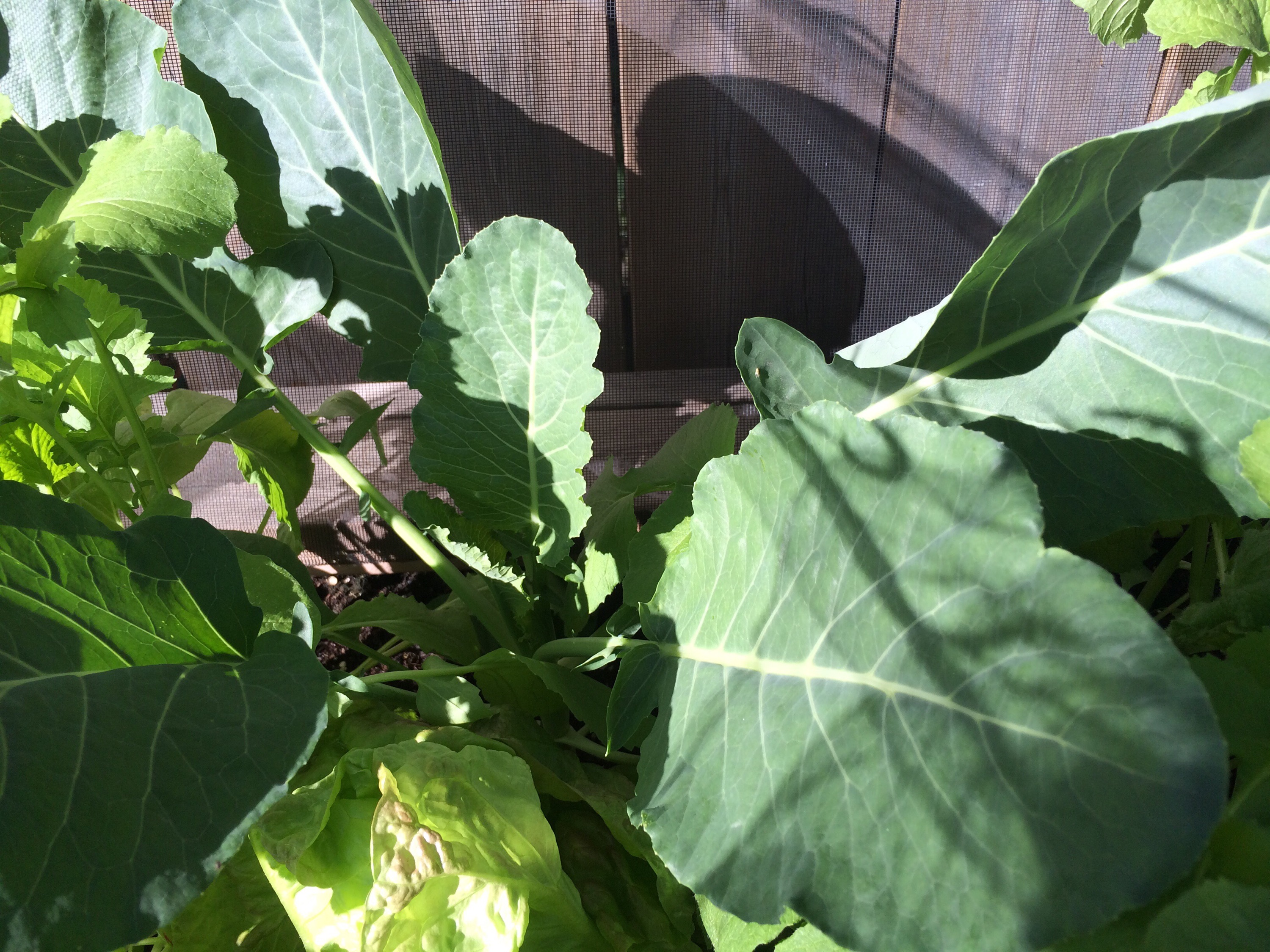 The cauliflower is not getting eaten by cabbage worms because this planter is netted! But really needs the radishes and lettuces out of its growing space…
