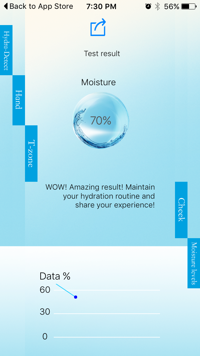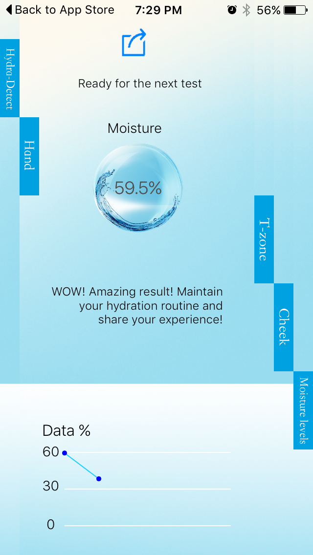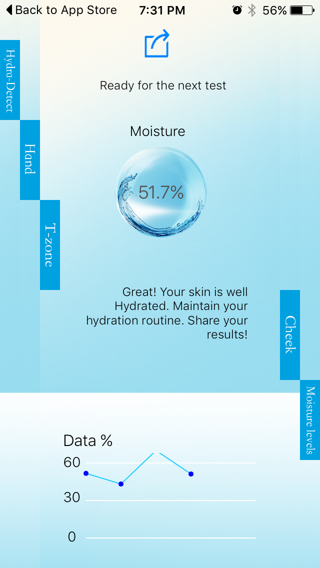 The Hydration Tool and App is actually kind of cool. You plug the Tool into the headphone jack in your phone and then press it onto your skin. Then it gives you a reading on how hydrated your skin is. I do wish that it would record your actual past readings rather than a vague little graph, but other than that, it is very interesting. I tested the different parts of my face as instructed, applied the creme and then tested again. I included some of the screen shots from the App at the end of the post so you can see the results.