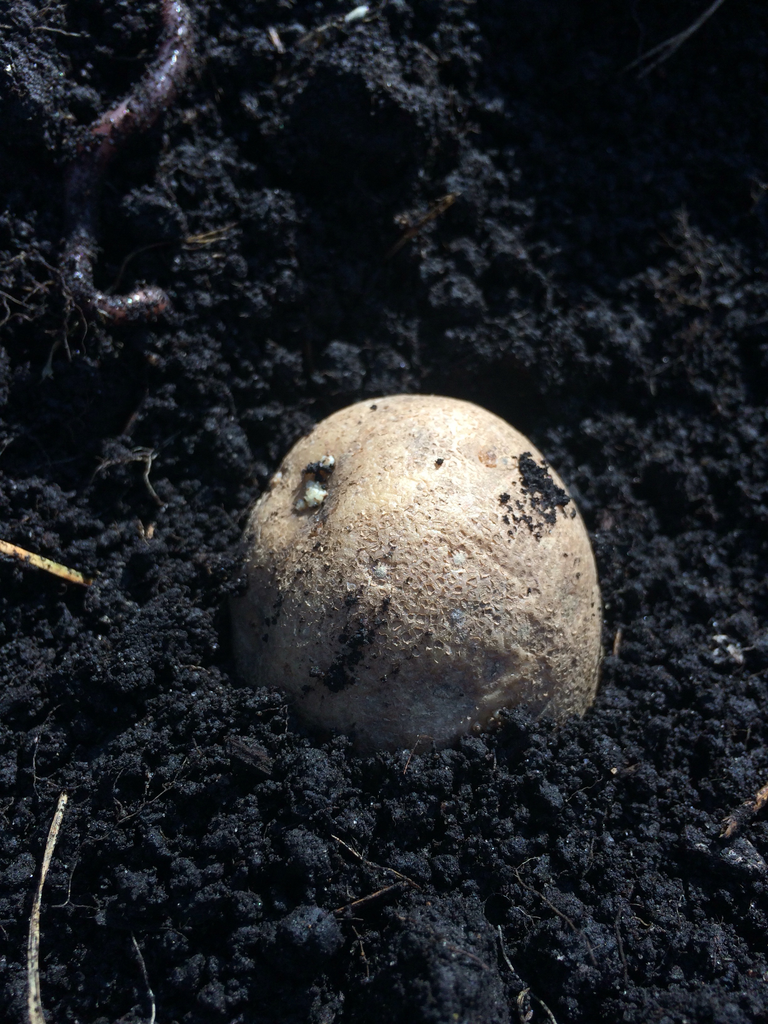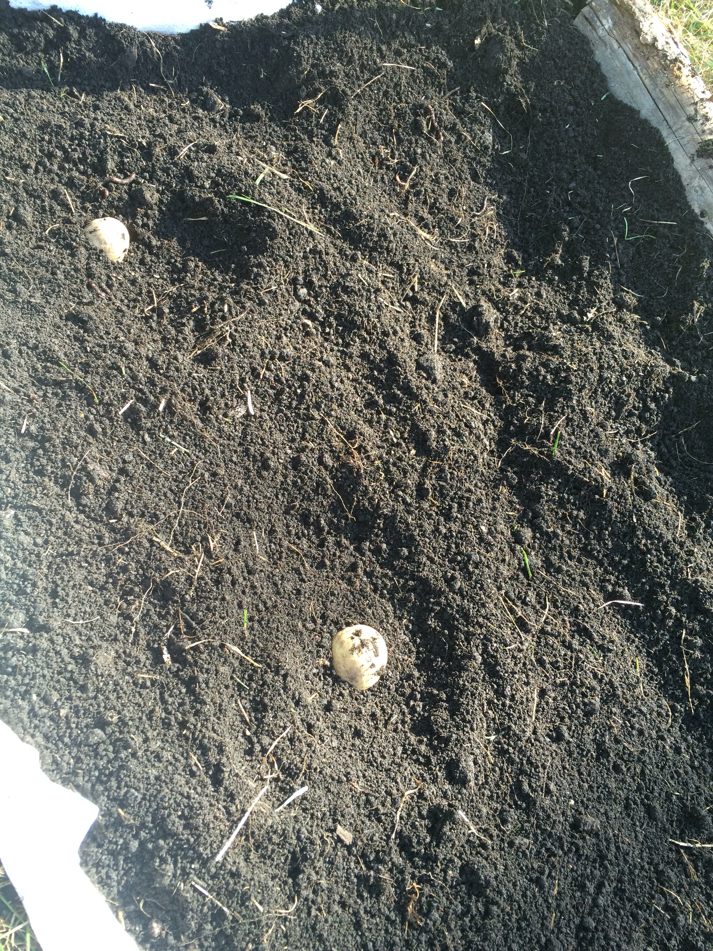 Update: my Mom had some straight-from-the-farmer potatoes that were starting to sprout some eyes, so I plunked them into the ground. I should have gotten a picture of the whole garden area before I drove back home, but it slipped my mind… But I’m sure you know what grass looks like and can use your imagination. Look at how amazing the dirt is in that photo above!
