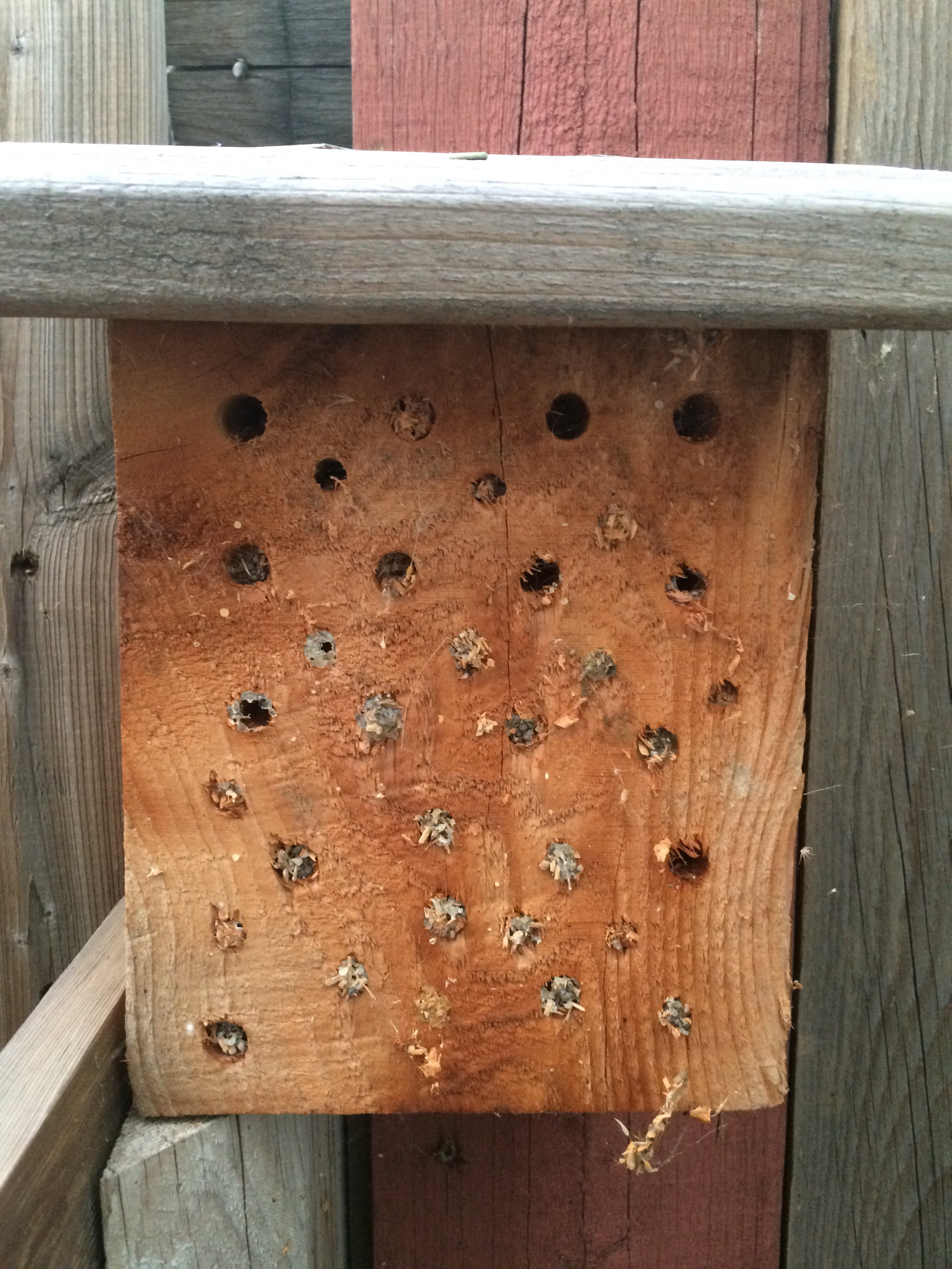 If you have room, and the ability, and the tools… “Build” yourself a Mason bee house. There are all kinds of plans online, but the basics are 5/16″ holes. I don’t remember the optimum depth of the holes, so you’ll have to google. Mine are probably about 4 inches, give or take. I put a few different size holes in mine, to see if they only used the 5/16. The 3/8 holes seem to also be used, but only lower down. The ones under the roof overhang are very vacant…so just use your best judgement.