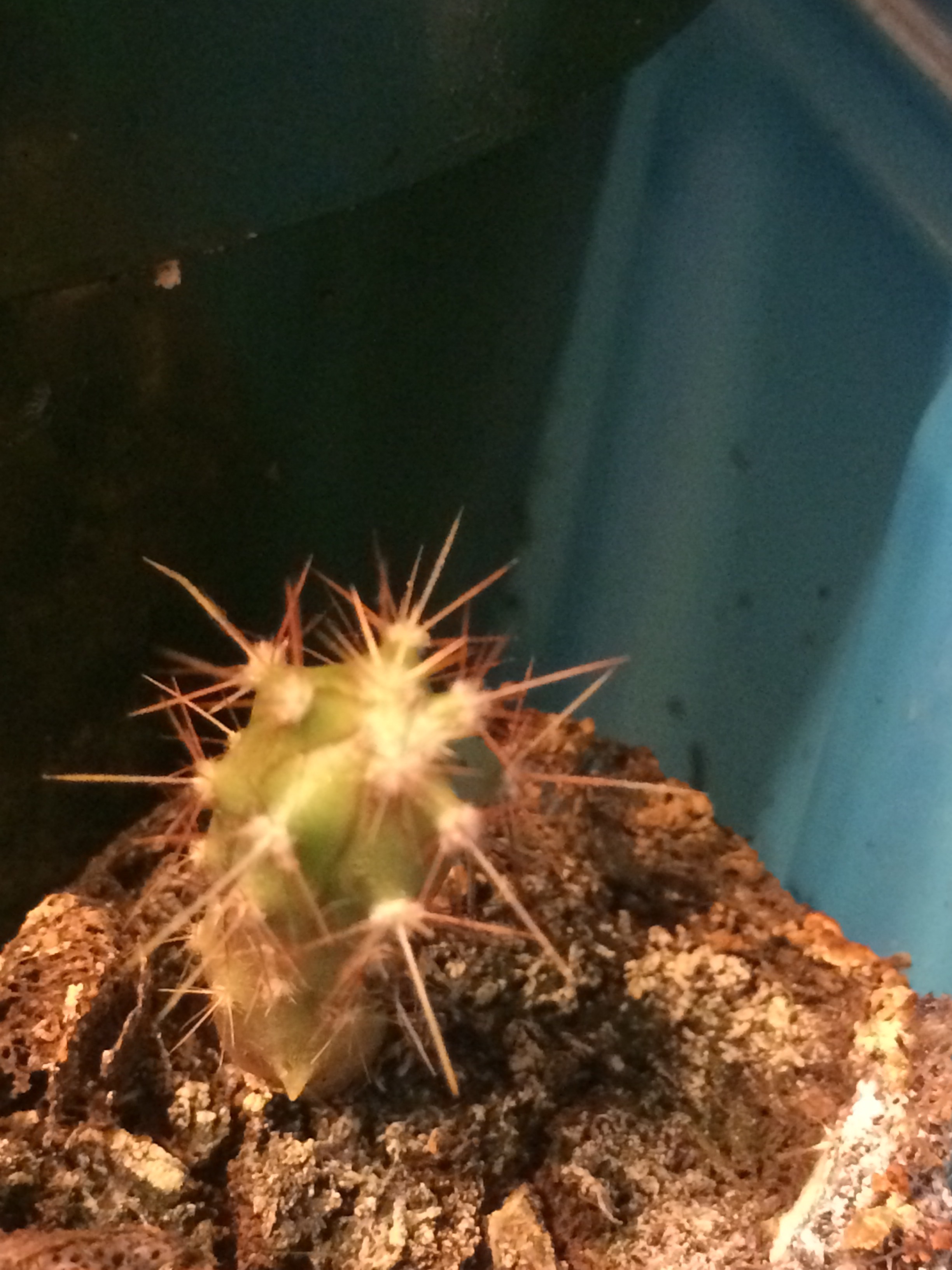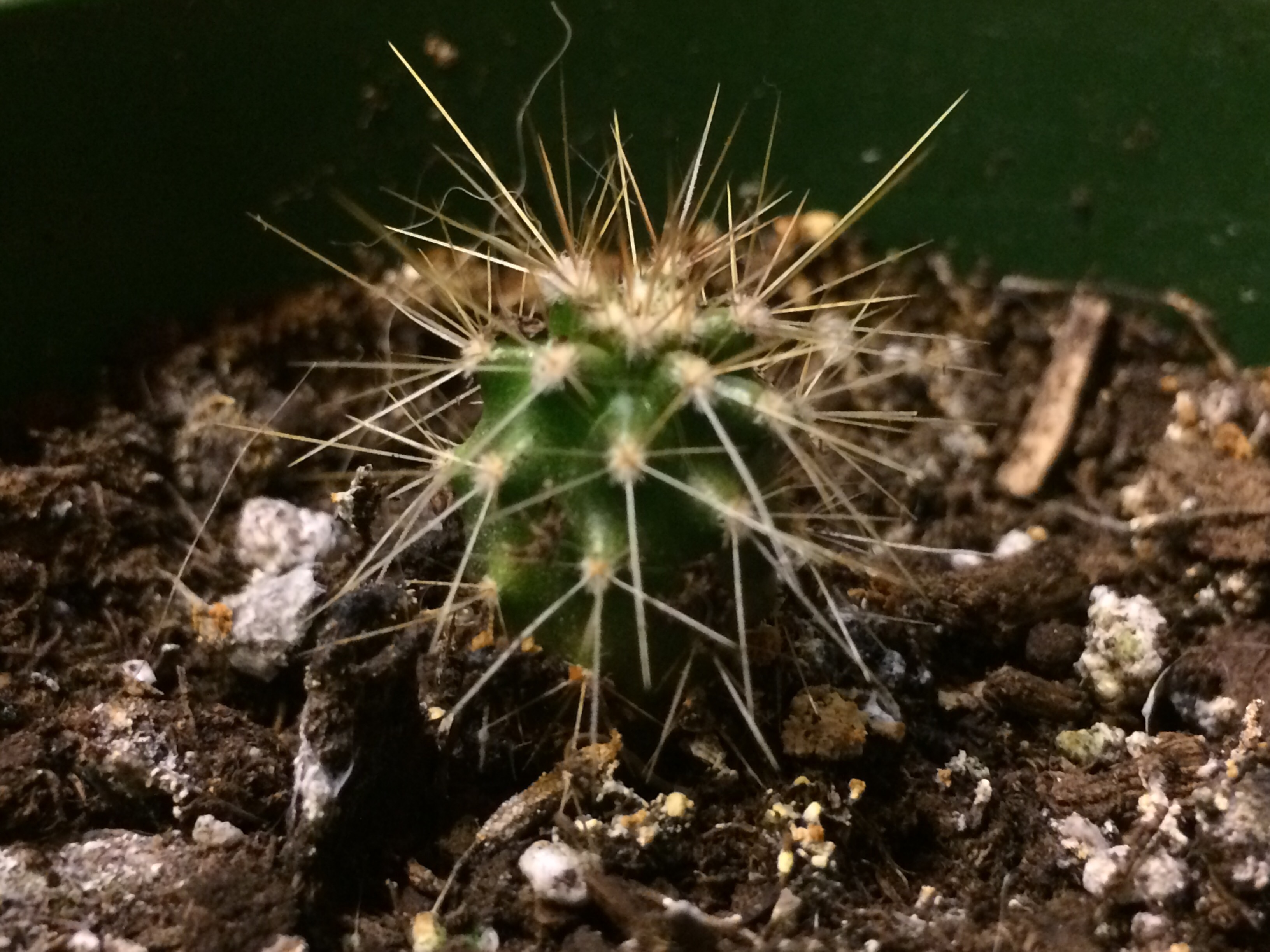So I thought I would update you on the cacti that I started from seed last year in January. There was an incident. The cats knocked the whole thing over, so there are a few less survivors than there would be otherwise… I currently have 4 survivors. 2 are in peat pellets, and 2 in the original 3″ pot I sowed them all in. The two in peat pellets were the only ones left with any rootball still attached when they fell to the floor. I didn’t want to disturb the ones in the pot that stayed in the soil any more than they already were, so I used some peat pellets that had un-germinated seeds in them, and here we are.