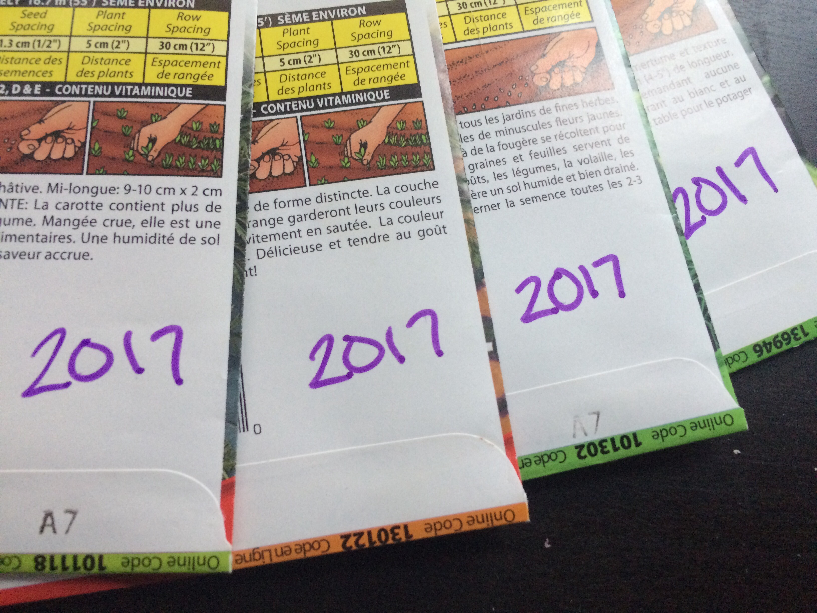 When you get new seeds, write the year you got them on the package. Most seeds are viable for a few years if stored in the correct conditions, so you don’t need to purchase them every single year if you still have some left. By writing the year on them, in a few years you will know that the germination rate of that package may not be the greatest. I grew some seeds I had left from 2013 last year and they grew just as well as the new ones.