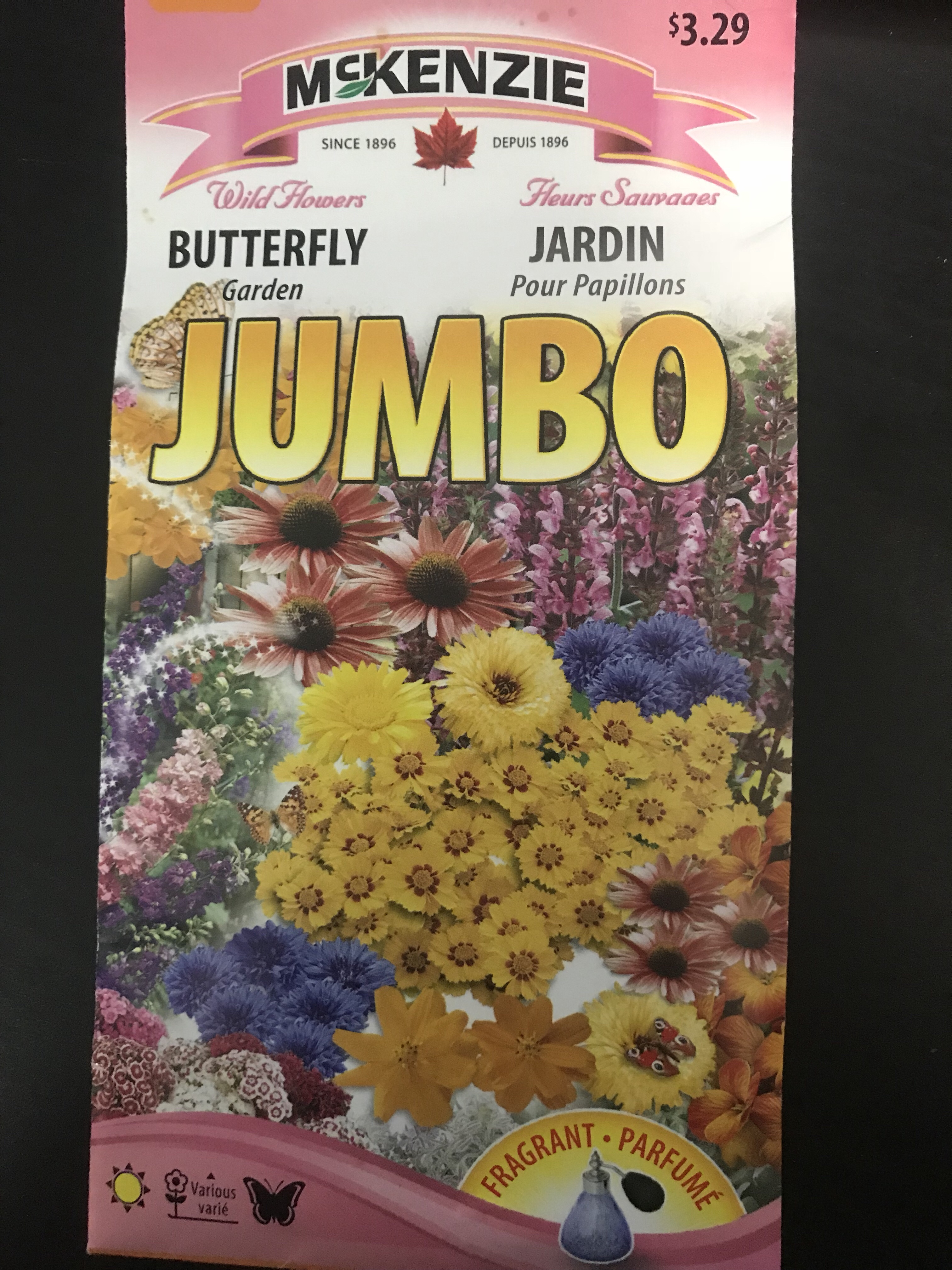 The seed packet description reads: “The butterfly mixture contains a blend of delightfully fragrant and colorful flowers that attract nearby Butterflies while adding beauty to your garden.”
