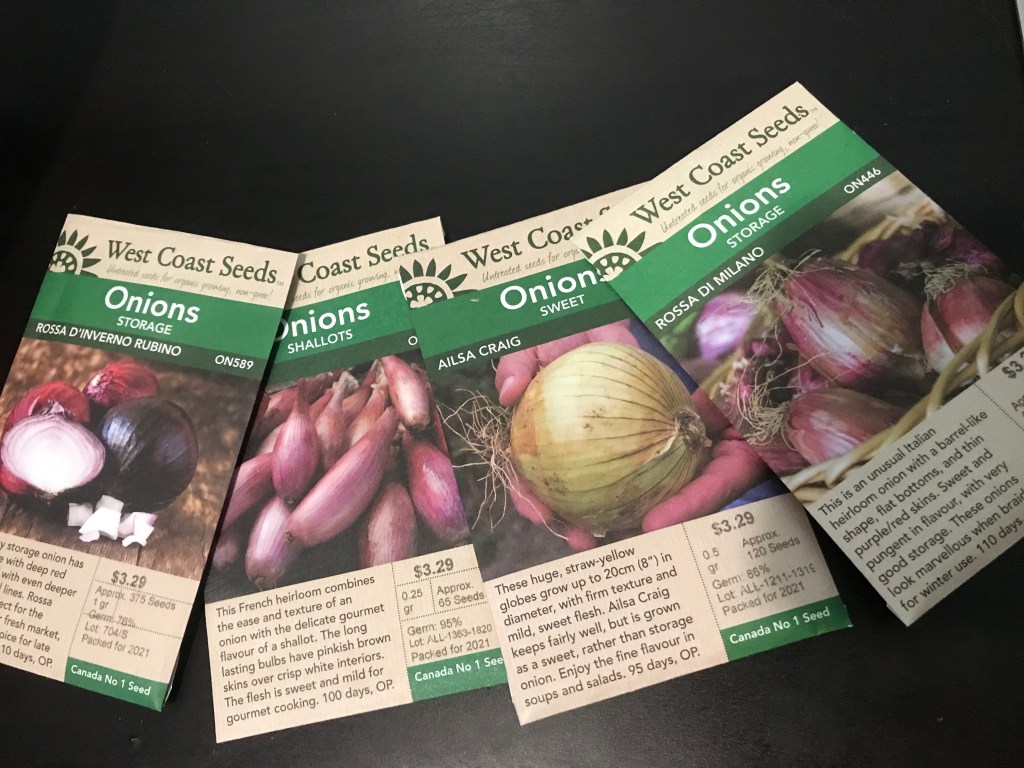 I have never really had successful onions growing from sets. They are small and not really suited to storing. (…and I never get many decent sized onions)… Which is fine if you just want a few onions for fresh eating, but my goals have shifted more to developing my skills in putting up food for the winter. Last year, I was able to braid up about 20 of my Zebrune Shallots last year and it has been fun using my own produce while its -20 and snowing outside. So this year, I decided to step up my onion game (or at least attempt to). I bought a few different varieties that are more suited to storage. Before I keep rambling on though, I’ll get to the varieties I will be (attempting) to grow this year.