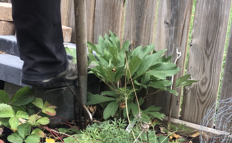 The best time to move peonies is in the fall. Since this is Alberta, we can quickly run out of “fall”. At the time of moving this peony, snow was imminent and could happen any time. Just a quick note here, that you can move peonies any time of the year, but in the fall, once they have finished blooming is the best time, as this will likely not set it back too far for blooms the following season.