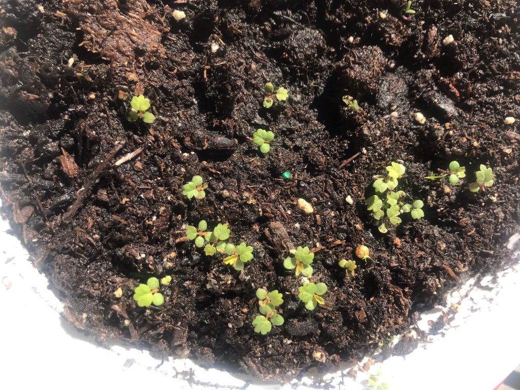 I had 3 packages of seeds that I have bought on a whim over the last couple years. I started them in old Chinese take out containers that I saved for this exact purpose. I used seed starting mix, but there was also some old potting soil mixed in as well. In two of the containers, I started other seeds too. I did some Munstead Lavender in one, and some really old Lavatera seeds that my grandma had saved for me from around 2010. (I didn’t really expect any of them to germinate, but they all did within like 3 days… I planted them in a container at my Dad’s)
