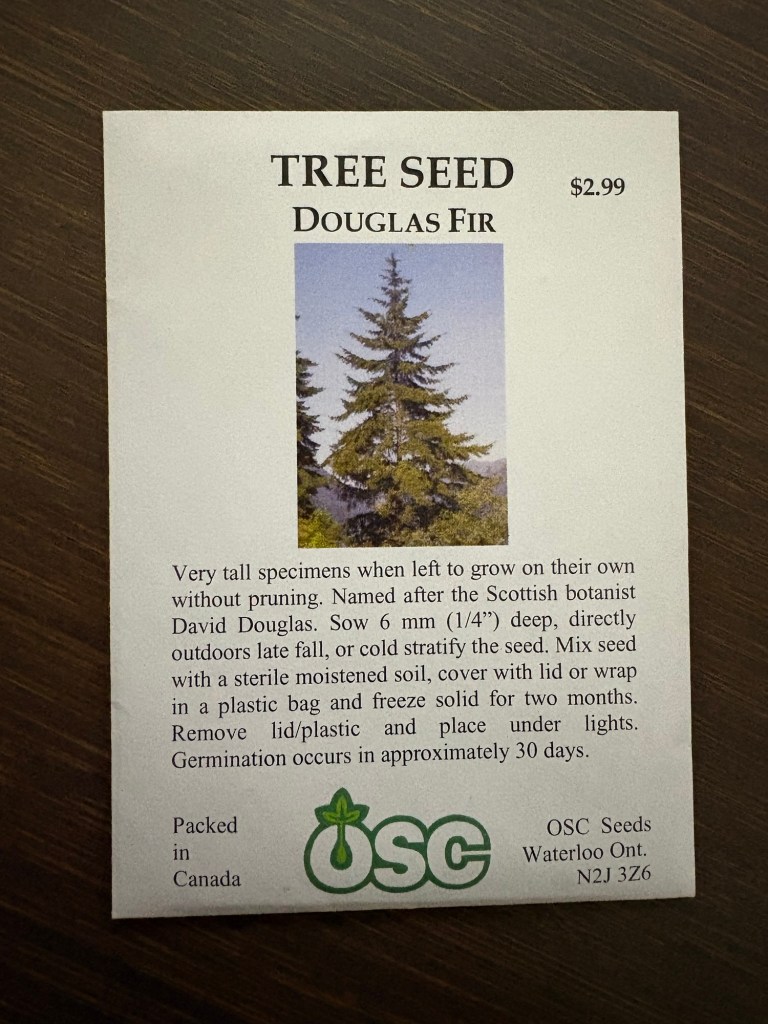 On a whim, I bought some seed to grow some Douglas Fir. I’ve always loved this tree, although there are only tiny pockets of it growing natively around here, so I have only really seen it on trips west to BC. They have the best little cones, with little tails poking out.