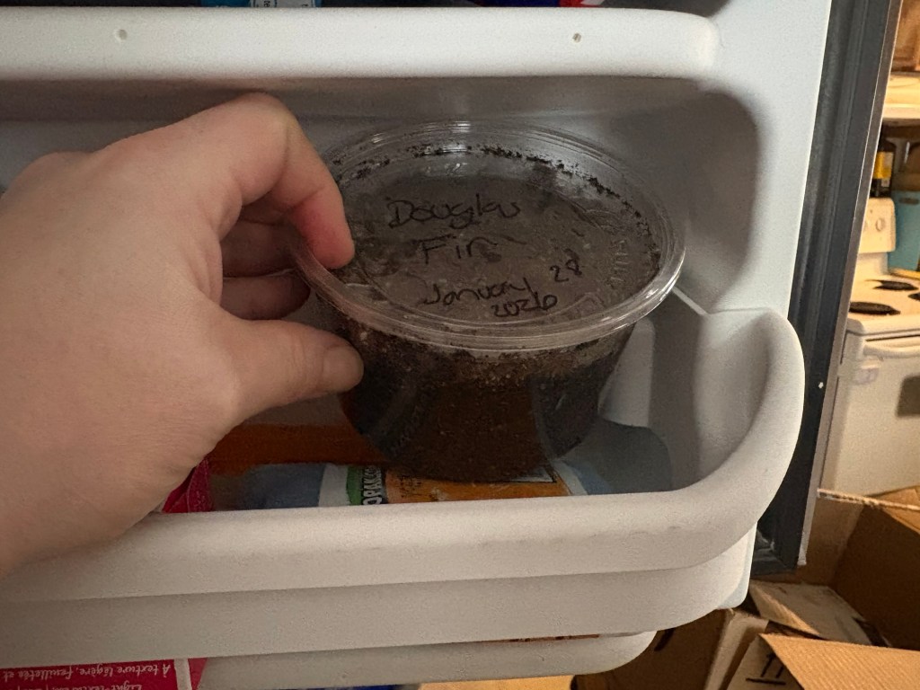 I followed those instructions, and used a washed plastic container (reused from cut-fruit from the grocery store). I watered well (but not too much, since its obviously not going to drain), wrote on the lid (so I don’t forget why I have a frozen block of soil in my freezer), and stuck it in the freezer. I’ll pull it out around the end of March. If the seed packet time-line is correct, there should be germination by the end of April. I’ll update when anything changes.